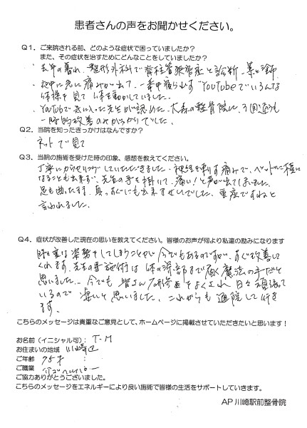 こちらに通う前は病院や整骨院に通ってはいましたが一時的には良くなるが 当院では丁寧にカウンセリングをして頂きとても安心感が持て まだ、変な姿勢を取ってしまうのか痛むこともありますが治療をするたびに これからも、頑張って通院していきます! (T・M様 70代 女性 川崎市) ※効果には個人差があります |