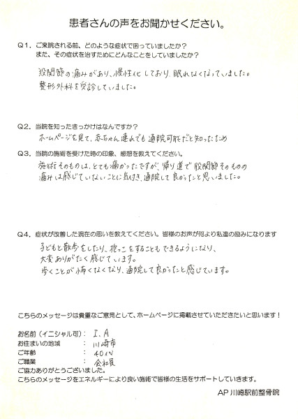 | 「歩く時に辛かった股関節の痛みが良くなりました!」