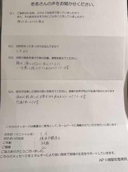 「長年の腰や脚の痛みが良くなりました!」 (A・T様 70代 男性 川崎市) ※効果には個人差があります |